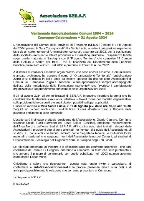 Il Convegno è stato organizzato per celebrare i 20 anni di esistenza dell'Associazione SER.A.F. e a riflettere sull'esperienza maturata al riguardo con gli attori che hanno partecipato, direttamente o indirettamente, alla sua nascita, vita e sviluppo. Il Convegno si è tenuto nella stessa sala dove fu firmato il Protocollo d'Intesa tra Sindaci che hanno dato vita all'Associazione nel 2004, cioè la Sala consigliare del Comune di Villa Santa Lucia.