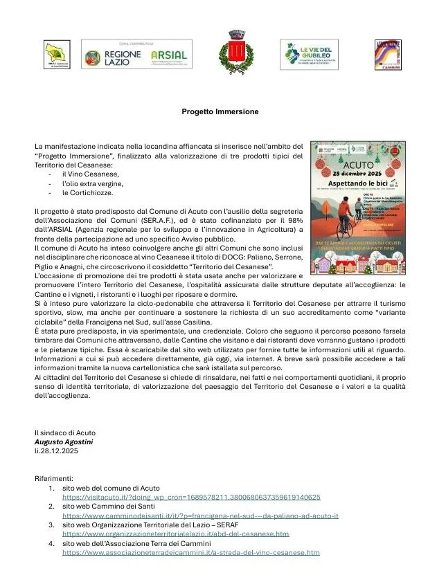 Domenica 28 dicembre 2025. La manifestazione è finalizzata a valorizzare ancora una volta i tre prodotti del progetto Immersione, cioè il Cesanese, l'olio extra vergine di oliva e le cortichiozze e, contestualmente, il Cammino che fa la Via Francigena "ciclabile" da Paliano ad Acuto attraversando il Territorio del Cesanese. Gli obiettivi che si conta di perseguire sono diversi: